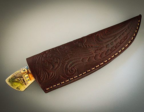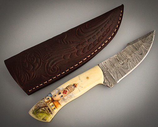 "Lighting the Way #4" Fixed Damascus Blade Scrimshaw Engraved Bone Handled Knife Scrimshaw engraved illustration of a lighthouse landscape, The fixed blade is hand made damascus by the knife makers at Silver Dollar City near Branson MO.