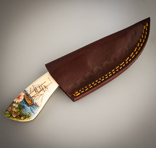 Illustration of a masted sailing ship with a shoreline with a field of tropical flowers scrimshaw engraved onto a wide shaped bone handled fixed blade skinner style knife.