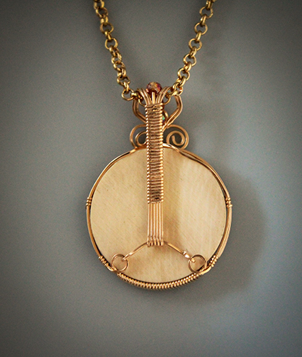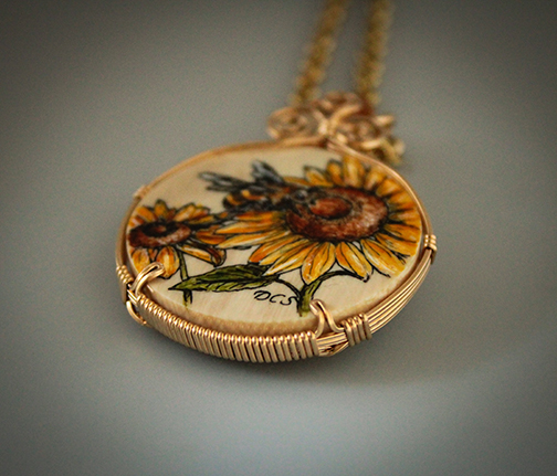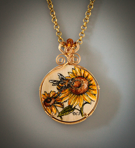 Illustration of a honey bee and sunflowers scrimshaw engraved on a round polished mammoth cabochon. The cabochon is set in 14k gold-filled wire sculpted setting. Amber Swarovski crystals are set down the center of the bail.18" Plated chain with lobster claw closure included (may vary from that shown).