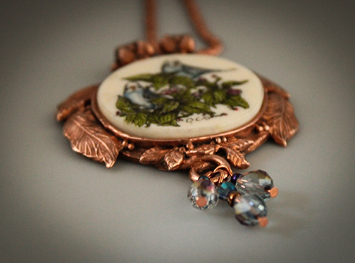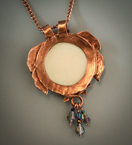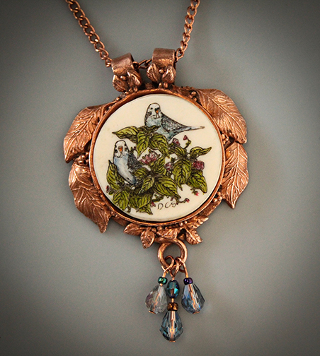 Illustration of 2 budgie birds scrimshaw engraved on a round polished mammoth cabochon. The cabochon is set in sculpted kiln fired copper precious metal clay.18" Plated chain with lobster claw closure included (may vary from that shown).