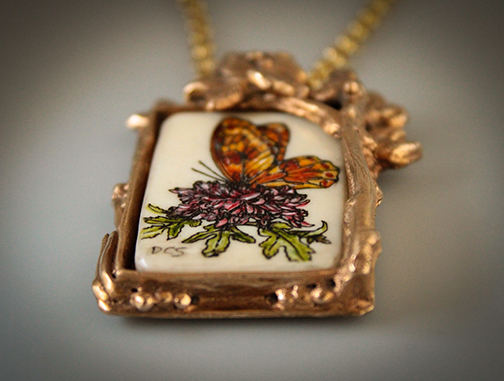 "Butterfly Garden #5" Scrimshaw Mammoth & Sculpted Bronze Pendant