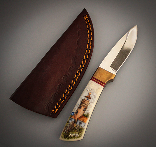 "Lighting the Way #4" Fixed Damascus Blade Scrimshaw Engraved Bone Handled Knife Scrimshaw engraved illustration of a lighthouse landscape, The fixed blade is hand made damascus by the knife makers at Silver Dollar City near Branson MO.
