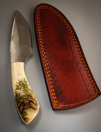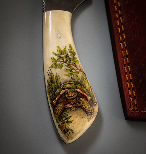 Illustration of a woodland path with a large box tortoise scrimshaw engraved onto a wide shaped bone handled fixed blade skinner style knife.