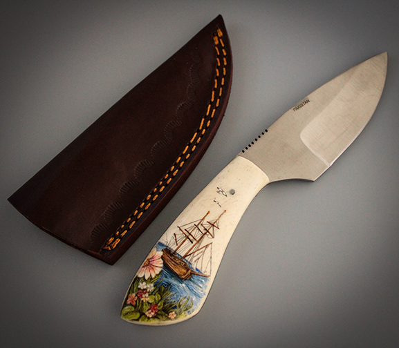 Illustration of a masted sailing ship with a shoreline with a field of tropical flowers scrimshaw engraved onto a wide shaped bone handled fixed blade skinner style knife.