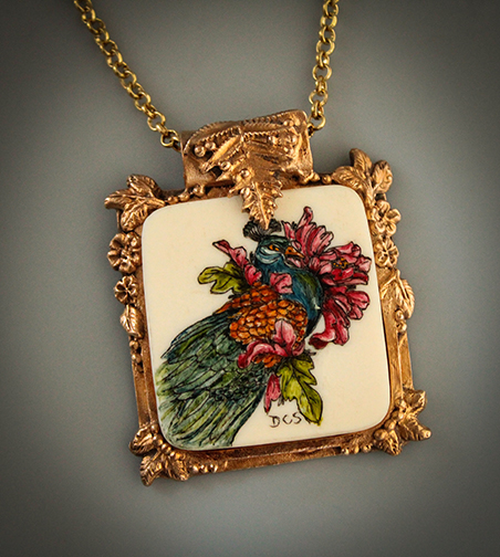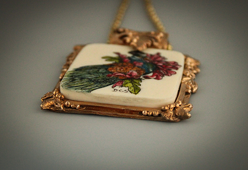 Illustration of a stylized peacock scrimshaw engraved on a square shaped polished mammoth cabochon. The cabochon is set in yellow bronze sculpted kiln fired precious metal clay..18" Plated chain with lobster claw closure included (may vary from that shown).